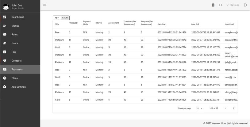 Here you can see all payments data of your paid assessments. Also you need to set your Stripe  secret key to accept payments for paid assessment by clicking Payment Settings button on top right corner.